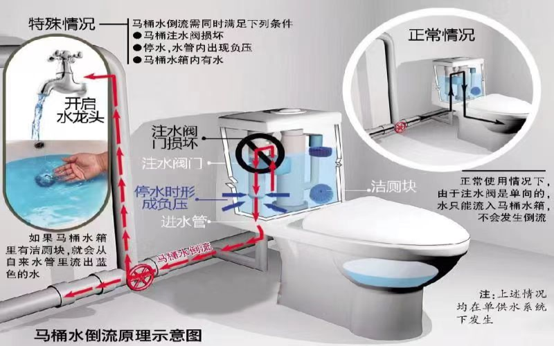 個別用戶發(fā)現(xiàn)從水龍頭中放出的自來水有時會呈現(xiàn)藍(lán)色。出現(xiàn)這種現(xiàn)象是因?yàn)橛脩粼趲鋬?nèi)放有潔廁靈(藍(lán)色),同時馬桶進(jìn)水管止回閥損壞導(dǎo)致。正常情況下,在管網(wǎng)壓力的作用下,水的流向是正向的。但由于停水或者樓下有用水,在開啟閥門或水龍頭的瞬間,由于水流的突然變化,使樓上未用水的管道內(nèi)產(chǎn)生了瞬時負(fù)壓,將水箱內(nèi)的水抽入管道內(nèi),即產(chǎn)生了藍(lán)水現(xiàn)象。只需加裝止回閥,即可解決問題。