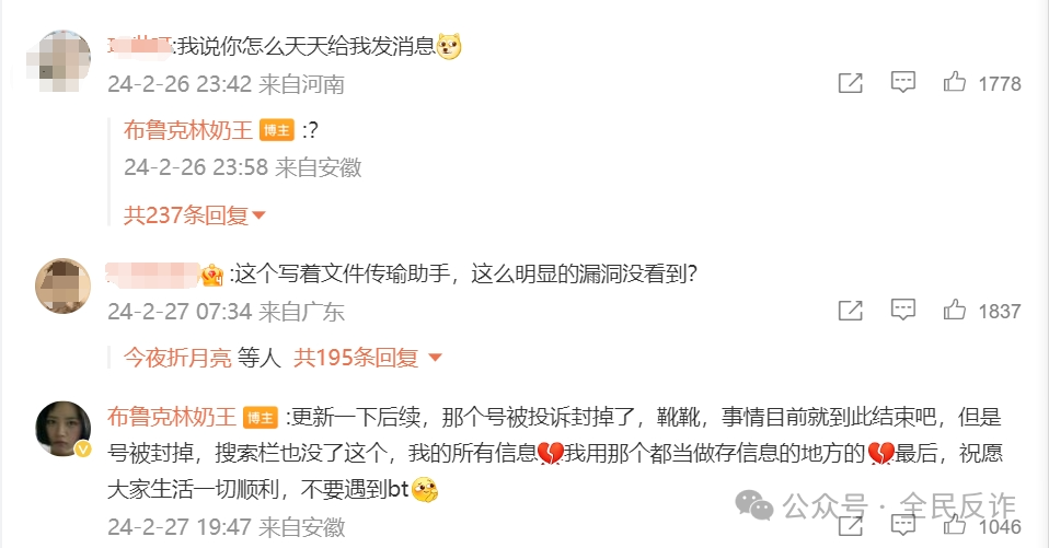 博主發(fā)帖后,在回復網(wǎng)友時告知事情進展,她去報案后,警方沒受理,隨后她向微信平臺投訴,那個號被封了。“但是號被封掉,搜索欄也沒了,我的所有信息也沒有了”,她說。