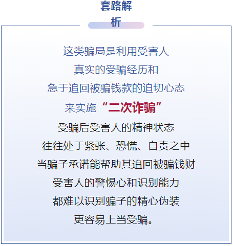 受害人在QQ、網(wǎng)上搜索“反詐中心”“在線報(bào)警”,騙子會(huì)假模假樣地指導(dǎo)受害人提供證據(jù)材料,再提出讓受害人向指定賬戶轉(zhuǎn)賬,最后導(dǎo)致受害人二次陷入騙局。