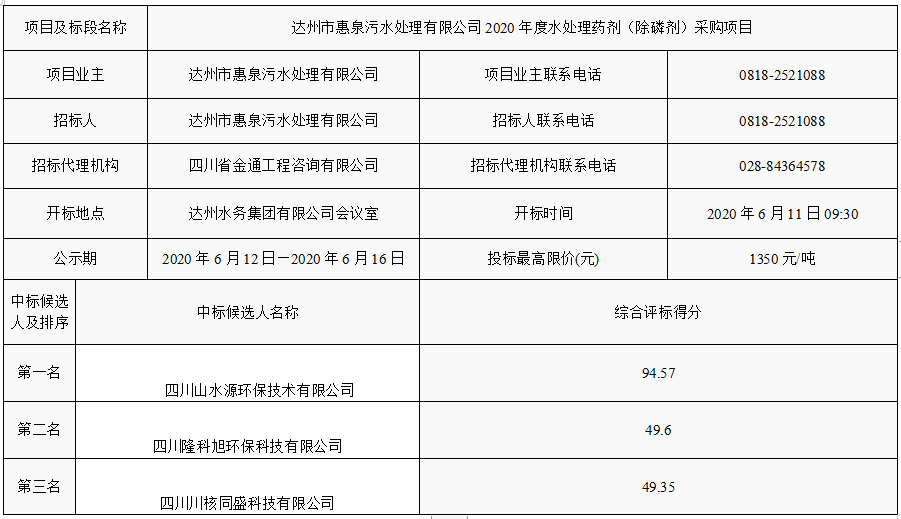 標(biāo)題:達(dá)州市惠泉污水處理有限公司2020年度水處理藥劑(除磷劑)采購(gòu)項(xiàng)目中標(biāo)候選人公示