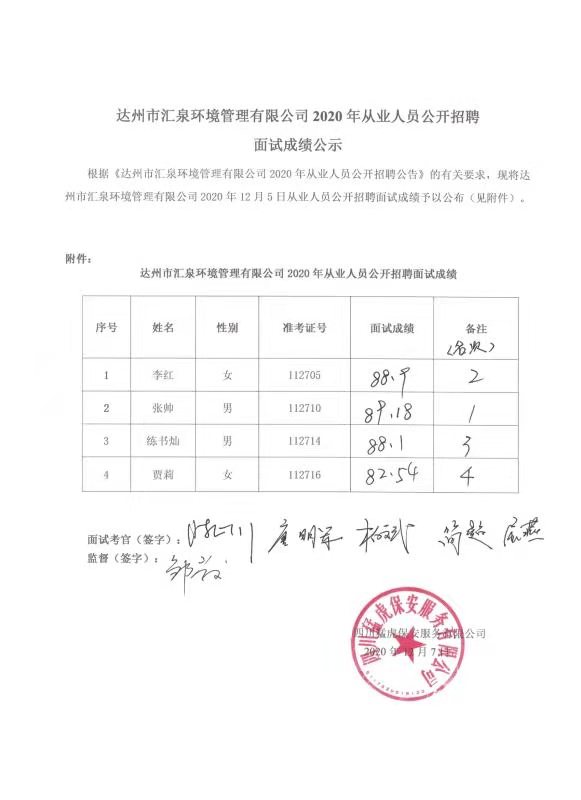 標(biāo)題:達(dá)州市匯泉環(huán)境管理有限公司2020年從業(yè)人員公開招聘面試成績公示